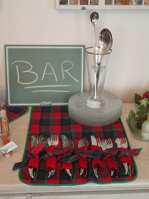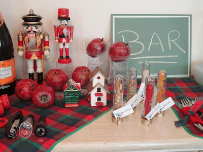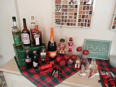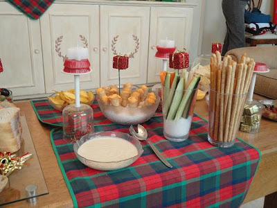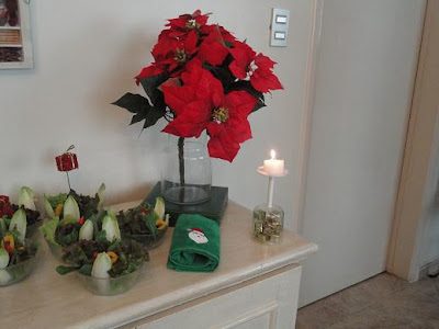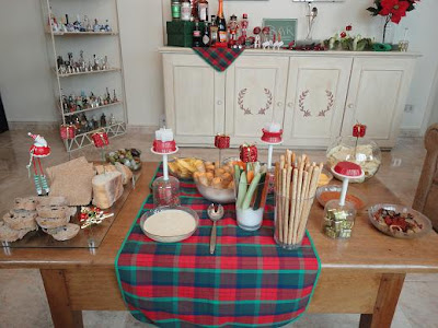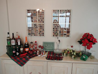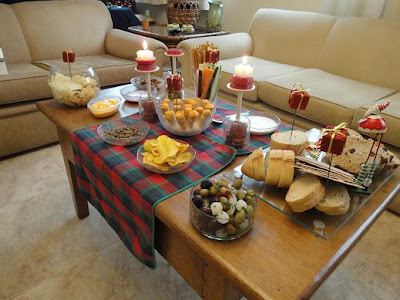 Na decoração, flores vermelhas, espetinhos com mini pacotinhos de presentes, castiçais feitos de cálices de ponta cabeça e velinhas, muitas velinhas ......