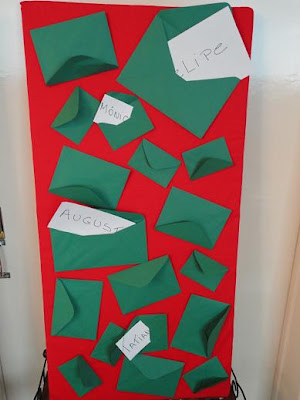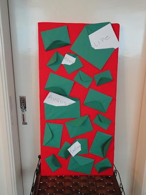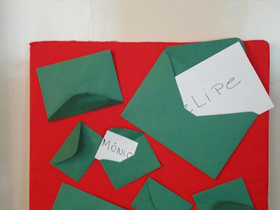 Envelopes verdes, de tamanhos diversos, com os nomes dos participantes, que cada um foi abrindo e lendo para a troca de presentes.