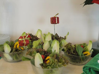 Para começar, mini saladas leves em bowls de vidro.