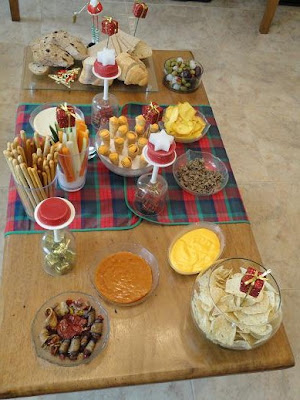 Uma reunião com farta mesa de aperitivos, onde cada um leva sua parte.