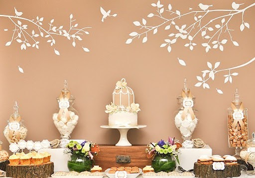 Começando com uma festa que tem "cara de outono-inverno", devido à paleta de cores (marrom, café com leite e creme), apesar da parede atrás ter um adesivo de árvores com folhas e passarinho.