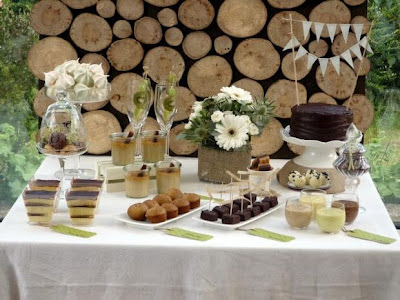 Com a mesa de doces montada sobre um bufê patinado, grossas toras de madeira servem de apoio aos potes com sobremesas em camadas ....