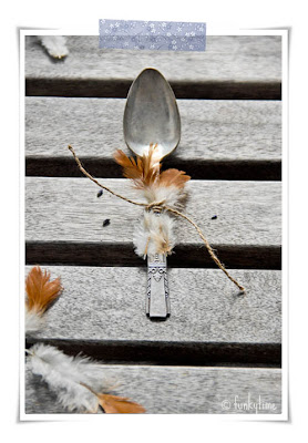 4. Amarre à colher uma pluminha de ave usando o barbante ou corda fina.