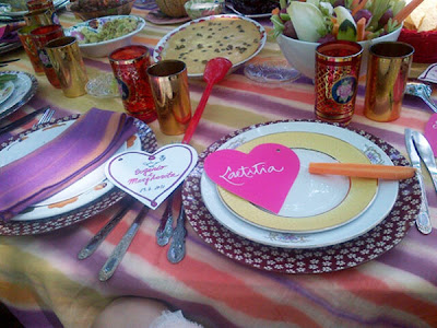 A mesa com um mix de cores nas toalhas listadas, louça e copos, tapetes, futtons, almofadas.
