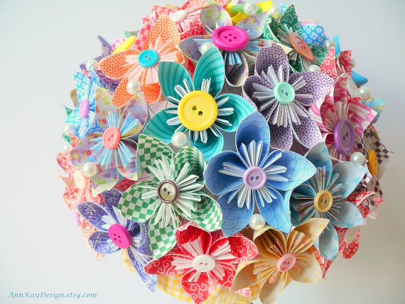 Os buquês da Ann Kay Design são feitos com papel para scrap estampados decorados com botões, um charminho a mais.