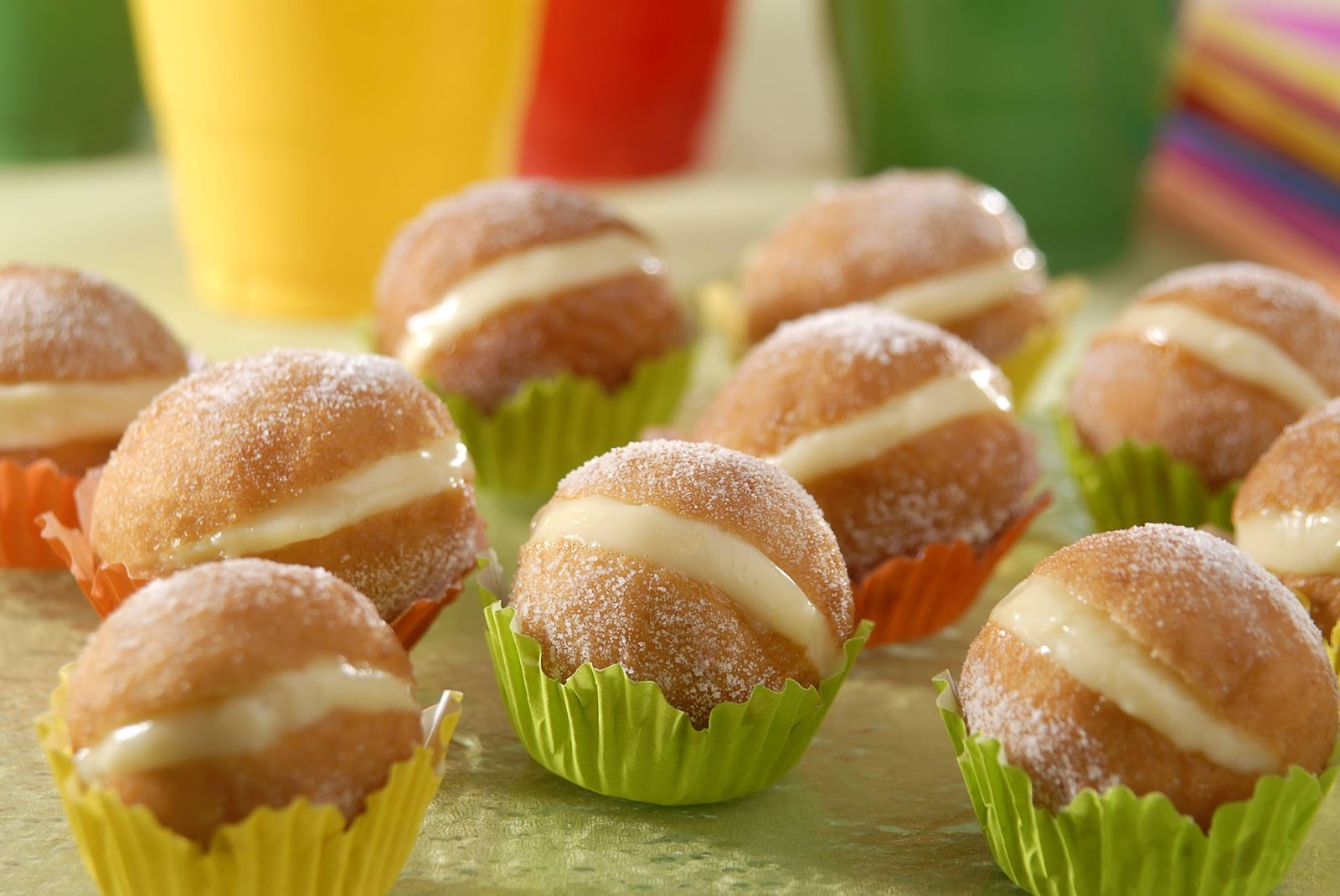 Com formato de bolas, recheados com baunilha ou outro creme, os chamados de "sonhos" ficam fofos servidos em forminhas de doces.