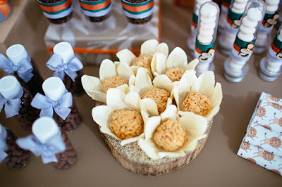 Toras de madeira como suportes para doces boleados em forminhas no formato de flor.