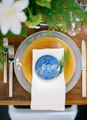 Foi usado um jogo de jantar na cor caramelo-ouro sobre sousplat de louça e os nomes dos convidados foram escritos com canetas douradas em pedaços de pedra azul !