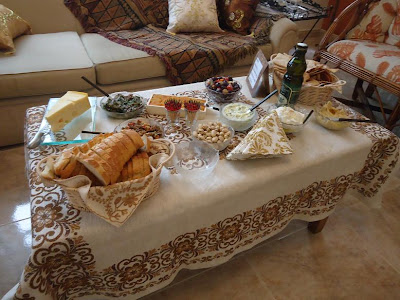 Numa mesa de centro baixa, com toalha típica, foram servidas as entradas.