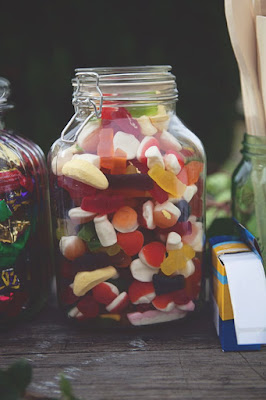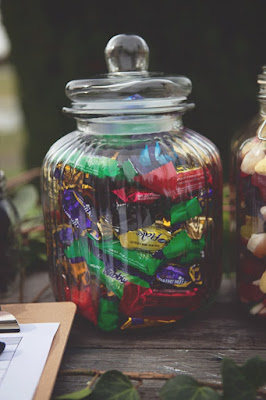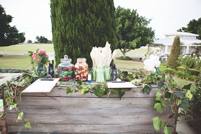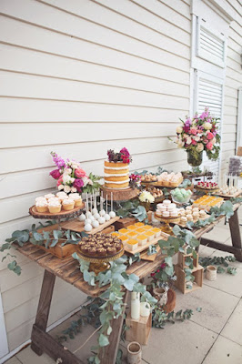 Macarrons, tarteletes, tortinhas de frutas, petit-fours em suportes de andares e vidros de farmácia bem vintage.