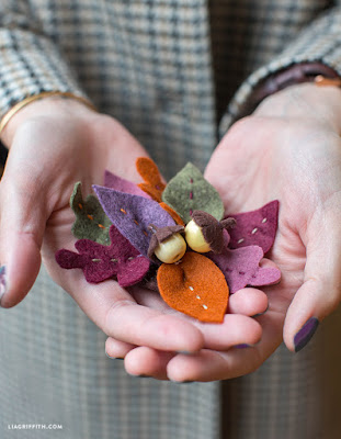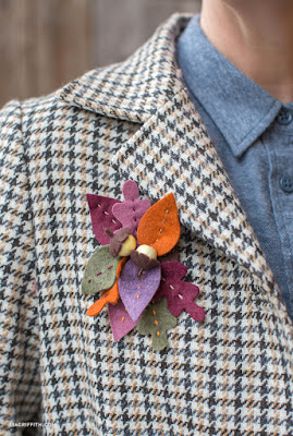 Broches de feltro com motivo outonal : folhas e avelãs.
