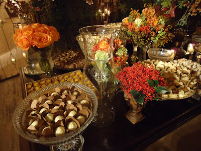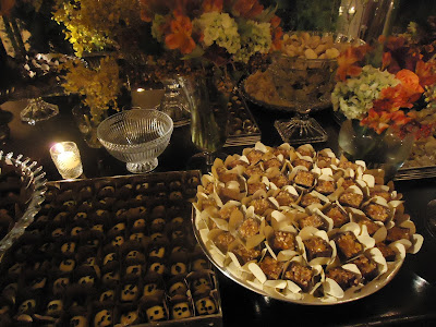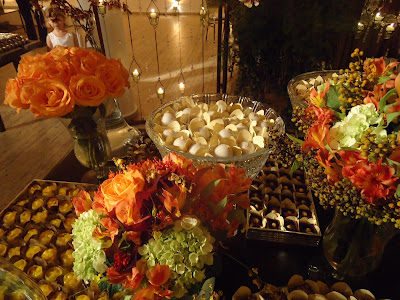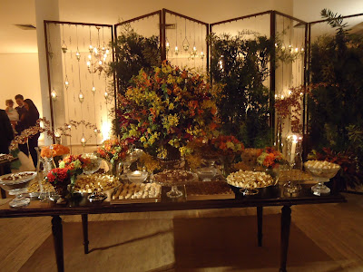 A mesa dos doces, no primeiro salão, tendo como fundo um biombo decorado com velas, foi a sensação, montado com docinhos e forminhas todos em tons do bege ao marrom, tom sobre tom, num efeito ombré.