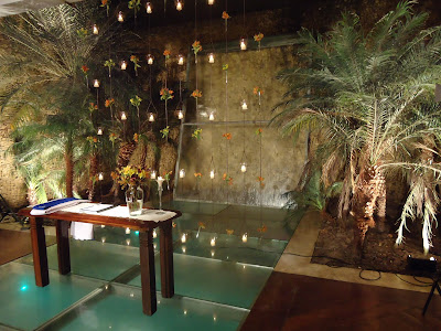 O altar com parede de vidro pela qual escorria água, decorada com mais flores e velas.