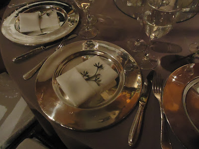 Sousplats e faqueiros de inox com guardanapos dobrados em forma de bolso com mini ramo.
