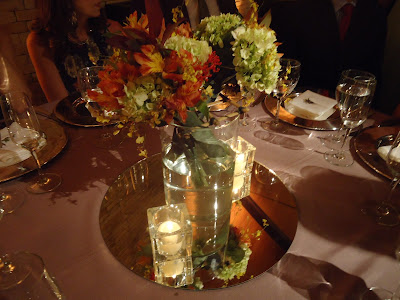 Cada centro de mesa um diferente do outro, com muitas flores e velas sobre bases de vidro ou espelho.